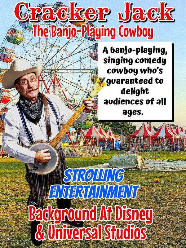 Greg Thompson portrays Cracker Jack. With over 30 years of experience in the entertainment industry, Cracker Jack- The Banjo-Playing Cowboy has honed his skills and perfected his craft. He has worked with various clients including corporate events, private parties, and music festivals.
